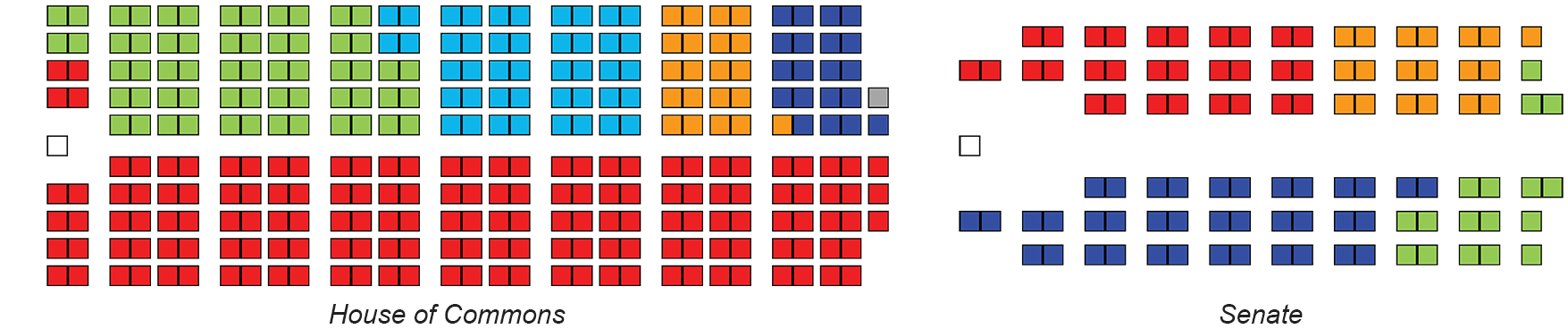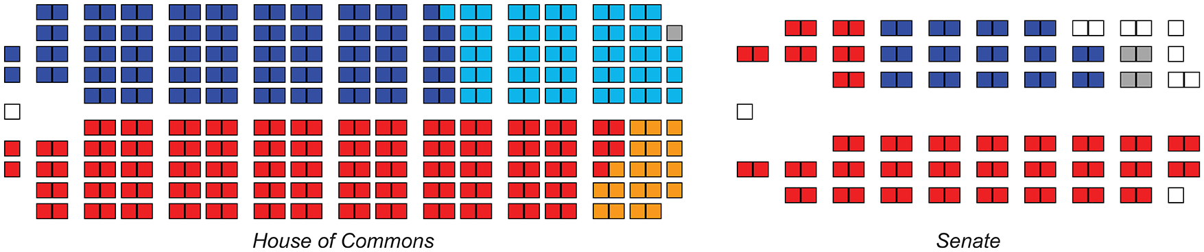 * These are the seat distributions the day of the federal election that is indicated; see Parliament of Canada, Elections, (Ottawa: Library of Parliament database, n.d.).